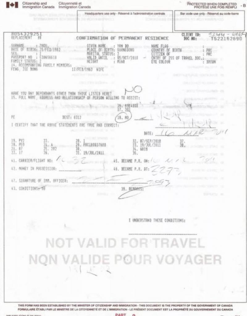 在周延波当选陕西省政协委员后,有网友发帖晒出周延波移民加拿大的一份证明文件。北青报记者看到,这张表格的左上角标有“加拿大移民局”,表格名为“永久居民身份批准证明”(Confirmation of permanent residenc)。据该表格显示,这张表格的申请人是“ZHOU,YAN BO”,1962年2月25日出生,身高1米68,眼睛颜色为棕色;护照号码为630656610,有效期限到2018年10月5日。而在“家庭成员”这一栏,显示妻子名为“FENG,JIE DONG”,出生日期为1963年2月17日。在表格一处,还模糊显示有“周延波”的中文签名。