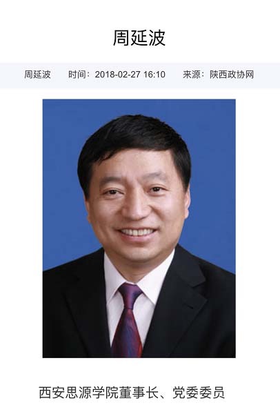 据公开资料显示,周延波出生于1962年,湖北光化人。现为西安思源学院董事长、北京邮电大学世纪学院董事长。据陕西政协网公示,2018年2月起,周延波当选陕西省第十二届政协委员。