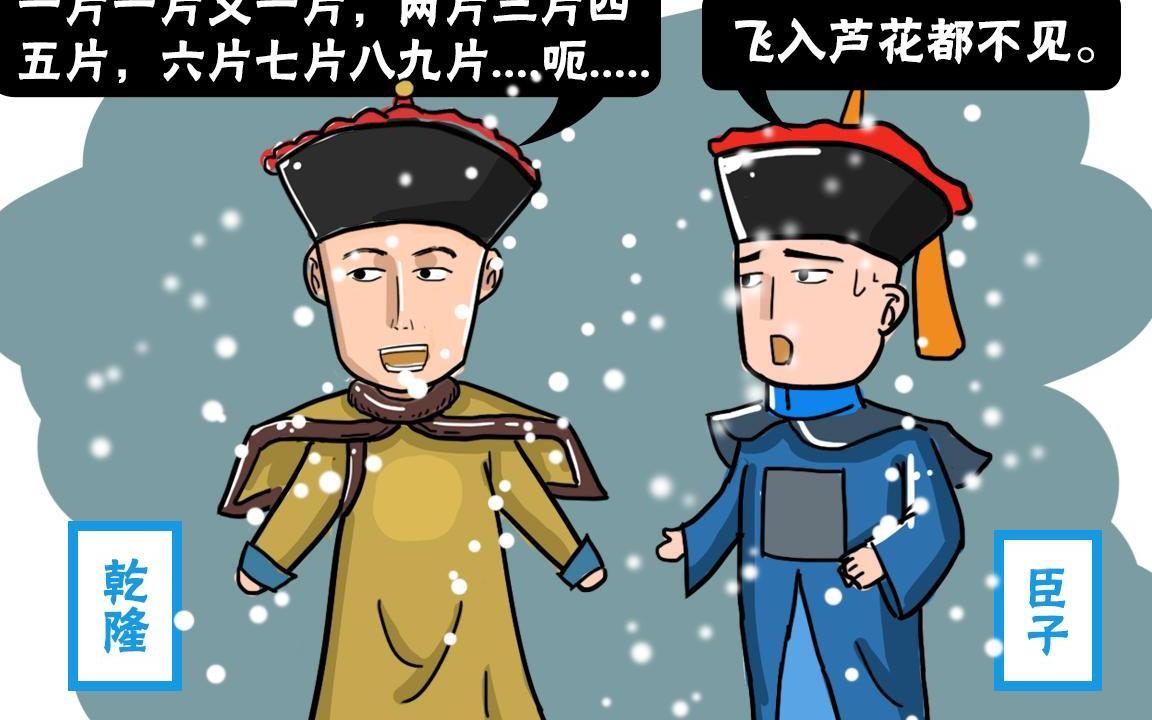 据说乾隆有一次和臣子微服私访到了杭州西湖,看着西湖的美景,他情不自禁的沉浸其中。就在这时,天空中竟然飘起了大雪。乾隆见景生情,随口吟诵道:“一片一片又一片,两片三片四五片,六片七片八九片,…”在最后一句时,死活想不出来了。随行的臣子看皇帝陷入了尴尬,立即补救道:“飞入芦花都不见。”于是这首《飞雪》就此诞生。