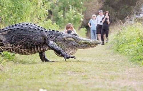 说起鳄鱼,那可是一种谈虎色变的一种动物。而在美国佛罗里达州的这些游客却不一样,他们在当地的一野外进行游玩时,突然惊见一头四五米长的巨大短吻鳄悠哉地从草丛里爬出。