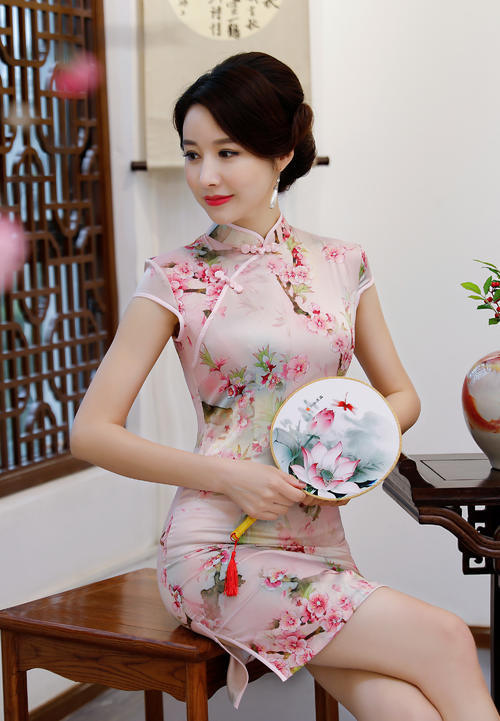 首先要介绍的第一款是粉色短款旗袍,这款旗袍是用轻纱面料精致而成,粉色做主打色,在面料上印染上了盛开的粉红色桃花,看起来一片春意盎然的景象,视觉效果上就让人十分愉悦。
