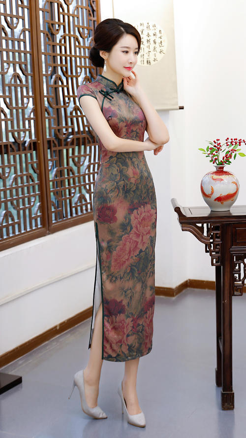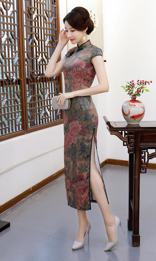 第三款要推荐的轻纱旗袍是一件长款的旗袍,这款旗袍颇有传统旗袍的风情韵味,也是灰绿色打底,图案用了淡红色成片大朵的花儿,显得非常成熟又不失妩媚娇柔,薄透轻纱做成的长款旗袍没想到穿在身上的效果能有如此之妙!