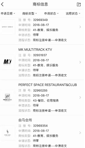 在2018年8月,该企业提交了15条商标注册申请,包括“白马会所”、“WHITE HORSE”、“PERFECT SPACE”等,不少提交申请的商标都出现在白马会所的官方网站上,但这些商标申请截至北青报记者发稿时,尚未获批。