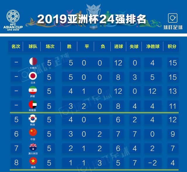 5战全胜且0失球的卡塔尔暂居首位,同样取得5连胜的日本队紧随其后,4胜1平且一球未失的伊朗队位居第三,东道主阿联酋排名第四,不过以上四支球队的最终排名仍需等决赛落幕后才能揭晓。