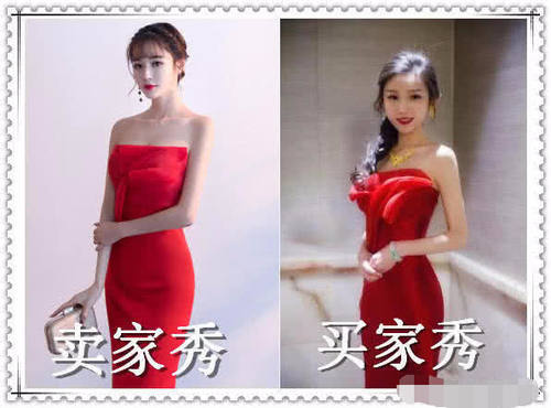 且看这第一位买家秀,她身上穿着的是一件红色的礼服,款式是那种特别迷人的抹胸裙,并且腰部的位置也是挺显身形的,再加上人家买家长得漂亮啊,比起模特穿着的效果,也是丝毫不弱的,而且还更有“人情味儿”了一般。