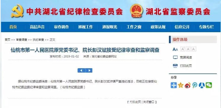 1月2日,湖北省仙桃市纪委监委发布最新消息宣布,仙桃市第一人民医院原党委书记、院长彭汉斌接受纪律审查和监察调查。