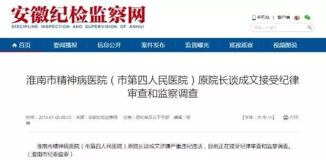 1月3日,安徽纪检监察网站发布消息:淮南市精神病医院(市第四人民医院)原院长谈成文涉嫌严重违纪违法,目前正在接受纪律审查和监察调查。值得一提的是,谈成文是2019年元旦假期结束后,被通报的安徽落马处级干部第一人。