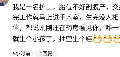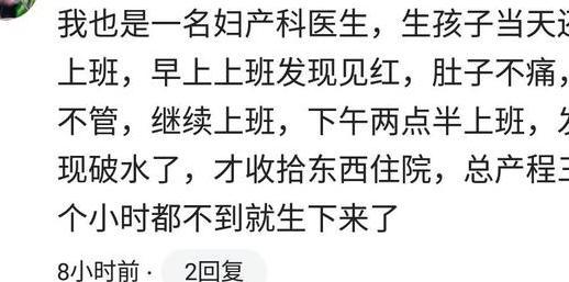 一笑倾城321:原来产科的同事,下午上剖宫产手术,手术结束五点,晚上八点临产生孩子!有个护士更猛,临产了还下病房,一直到宫口开大三指,直接进产房生孩子。不过的确都生的挺快的。