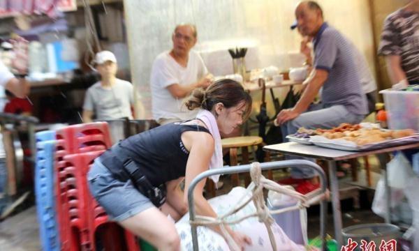 采访当天下着大雨,朱芊珮仍然在毓华街茶餐厅搬运白砂糖等货物,周围的顾客似乎都认识她,频频打招呼。