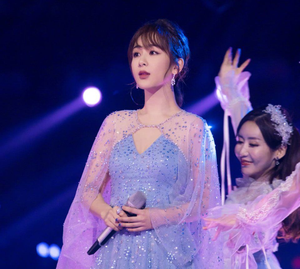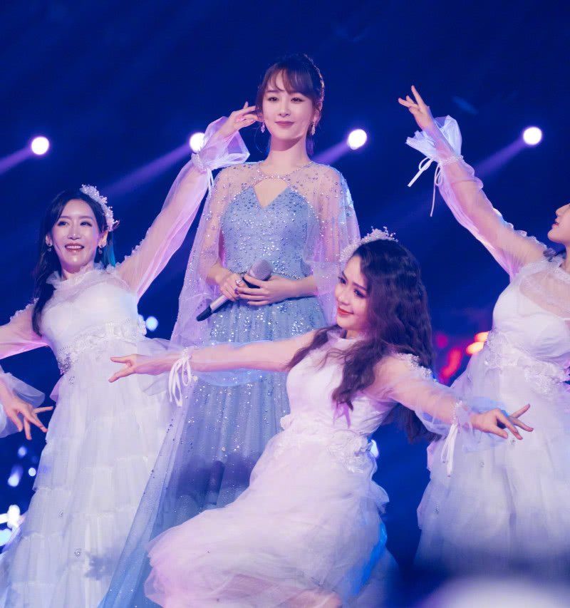 蓝色的网纱设计看上去真的是很美很有气质的感觉,搭配浅蓝色的连衣裙看上去是真的很美很有气质的这一身,杨紫在台上就像是仙女一样的感觉,笑起来十分的优雅,裙子上面很多的水钻,就像是有600颗。