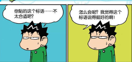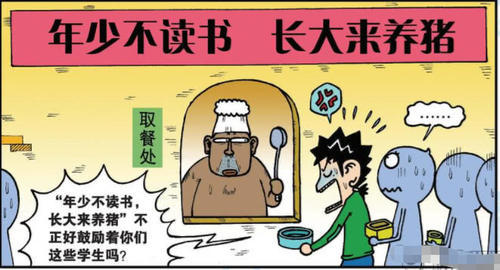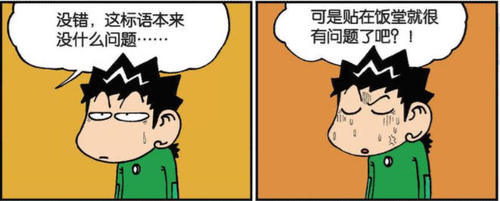 旺财看着眼前的标语一脸的无语,这标语是不是有些不合适?对方一脸的淡定,还好吧,他还感觉这个标语说的不错呢!旺财一脸的无语,这标语确实是本身没什么问题,但是...这‘年少不努力,长大来养猪’的标语,贴在学校的食堂真的好吗?可把旺财气的不行啊。