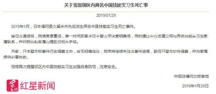 此事一经媒体曝光,在日本国内引发强烈关注。中国驻福冈总领事馆1月29日晚在官网发布消息说,对此表示高度重视,敦促日方加快事件调查,并表示将向遇害实习生家属提供必要的协助。