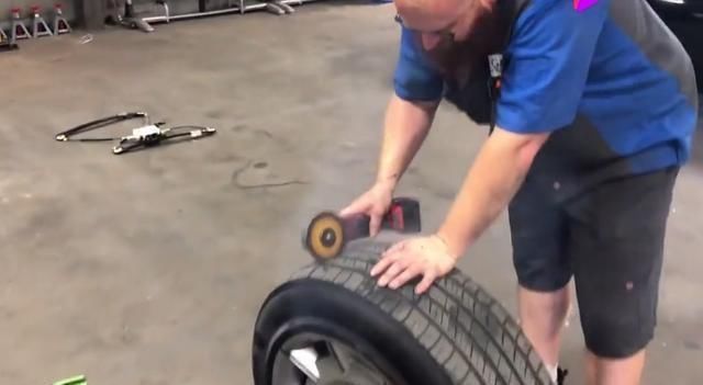 从图上我们可以看出,蓝色衣服的外国小伙拿了一把圆锯,在拆卸了幻影的轮胎之后,准备对轮胎进行切割工作,而一旁的摄影师也准备好了记录下这一刻,不得不说这个举动十分大胆(和有钱),看到这么贵的豪车轮胎要被切开,不免有点心疼,这一个轮子的价格也能买一辆车了吧?