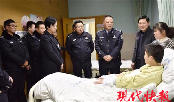 1 月 30 日下午,靖江市副市长、公安局长周如勇和其他局领导赶往医院,看望慰问秦凯,高度赞扬他为民着想、勇敢处置的行为,嘱咐他安心养伤,早日康复。
