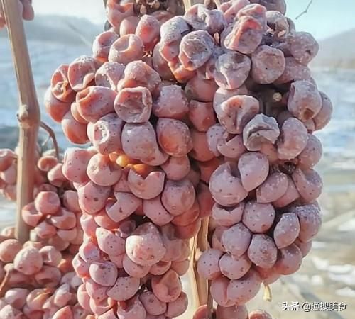 其实这样的葡萄果农们是用来制作一种酒,叫做冰酒,也叫冰葡萄酒,葡萄都是在零度以下放在户外自然冰冻,越冷就越好,冻出来的葡萄制作冰葡萄酒才更好,其实冻过的葡萄吃起来也更甜;要想制作出品质好的冰葡萄酒,这一步骤也是非常关键的,有的果农看到冰冻的葡萄,就能判断出冰葡萄酒的好坏!