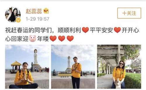 原来,赵蕊蕊是前往海南三亚度假,她在南海观音前拍照留念,身材很好,长腿很抢镜,颜值也很高,从行程来看,赵蕊蕊应该是独自一人旅行,这也是非常孤独了,不过赵蕊蕊还是非常享受这个时刻,她写道:祝赶春运的同学们,顺顺利利,平平安安,开开心心回家迎猪年喽。