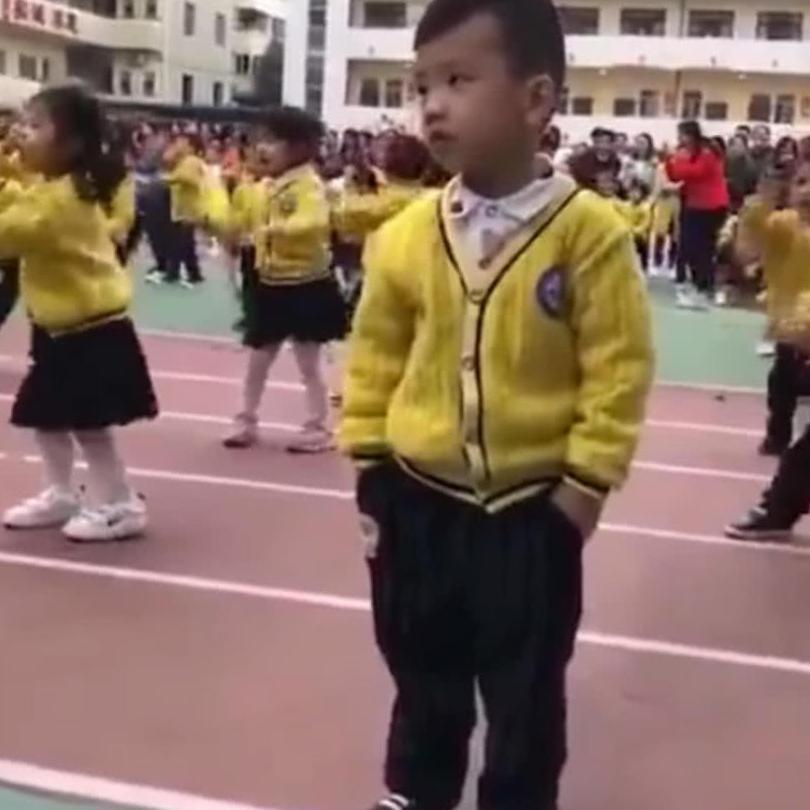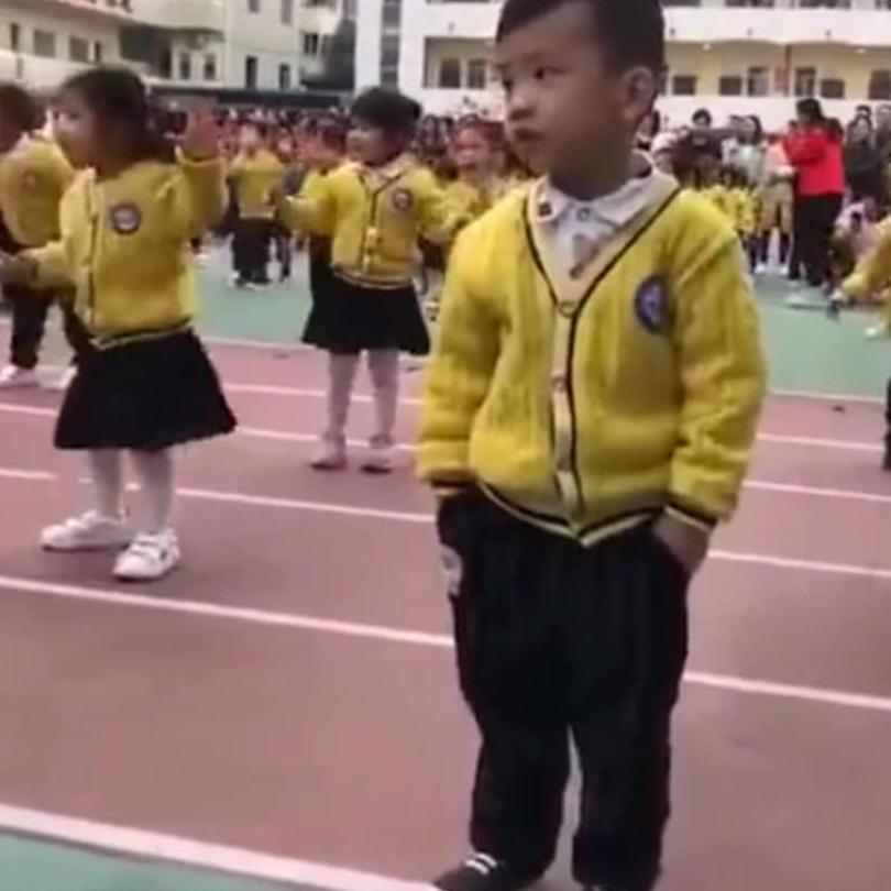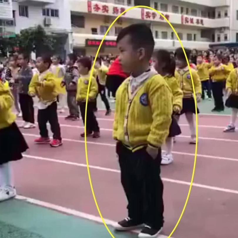 在一群统一穿着校服的、蹦蹦跳跳的小朋友中,宝宝的表现格外醒目,因为他实在是太淡定了。