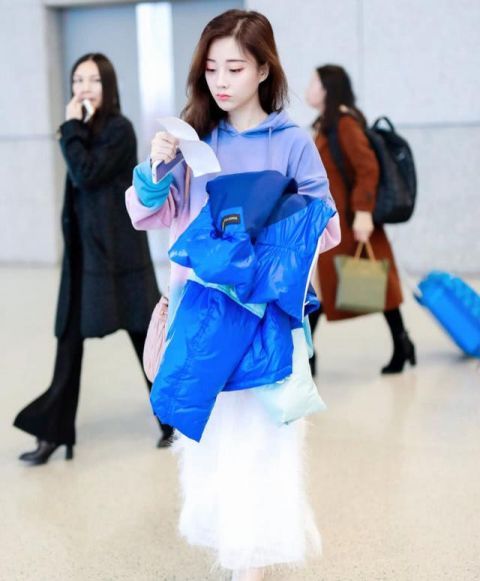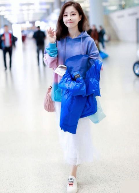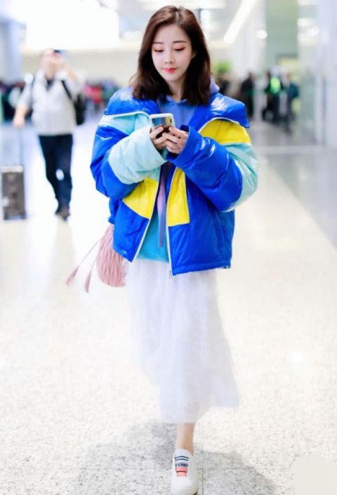 她上半身穿的是拼接款羽绒服,外套以宝蓝色为主,内搭的卫衣也是同色系,这种搭配很显利落感,但因为颜色很鲜艳,又显得十分亮眼鲜活,她的个子不高,但是却穿了1cm高的“纸巾鞋”。