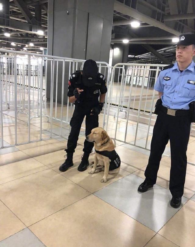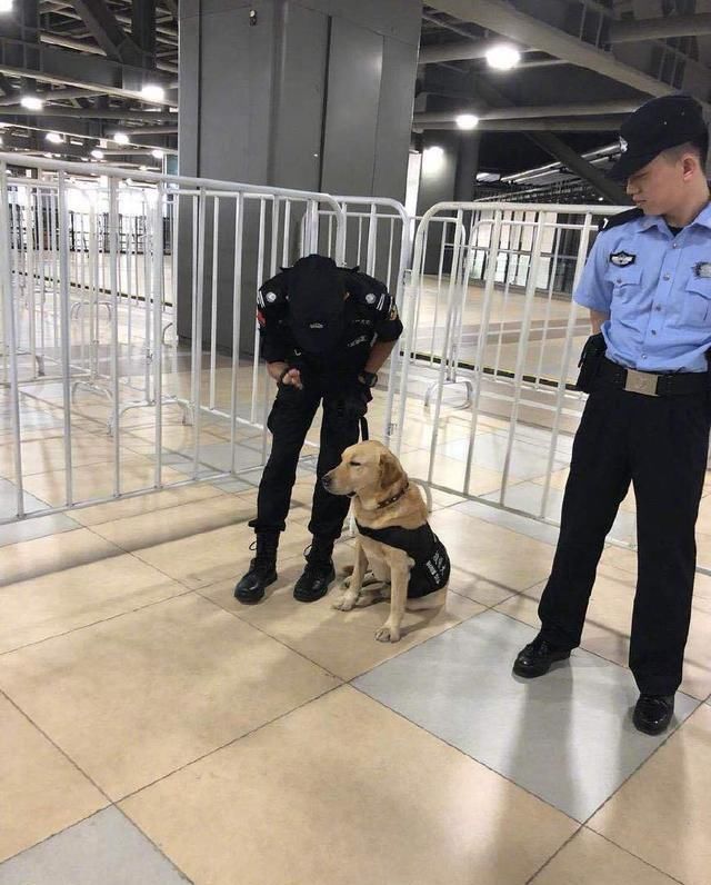 有路人看向警犬,两个穿制服的小哥哥大概也是觉得怪异,才发现是小金毛在打盹,都要笑翻了。穿黑色制服的小哥哥也忍不住了,就对着狗狗比了个手势:小家伙,给点面子啊!认真点,我们这是在执行任务呢。