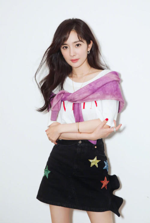 接下来这一身穿搭依旧是一身比较年轻减龄的穿搭,只见这次的杨幂身穿白色的简约T恤搭配一款黑色的荷叶边半身裙,凸显出气质淑女的既视感,但是彩色星星图案就显得比较活泼俏皮,很减龄!而这次杨幂在肩上绑上了一款紫色的衣服,当然也是凸显满屏的少女味的,看上去十分的韩范十足。