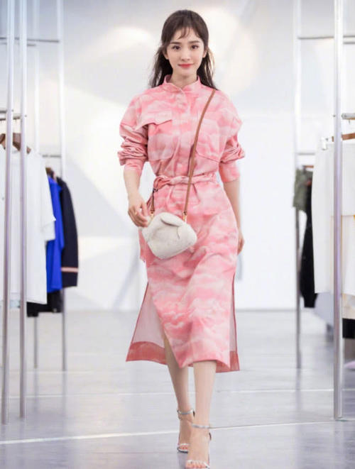 晕染款式的粉色系连衣裙也是比较适合杨幂的,只见这次的她身穿了一款圆领款式的衬衫裙出镜,晕染的设计有一种粉色天空的既视感,看上去十分的少女以及梦幻,搭配洗个高跟鞋,看上去简直不要太气质淑女呢,粉色穿搭配上一款白色的斜跨包包,相信这样的杨幂穿搭你们也很喜欢吧!