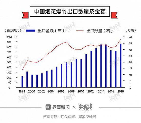 国家统计局数据显示,近20年来,中国烟花爆竹出口数量及金额不断增长,2018年分别达到37.90万吨、8.67亿美元,分别同比增长17.2%、20.3%。