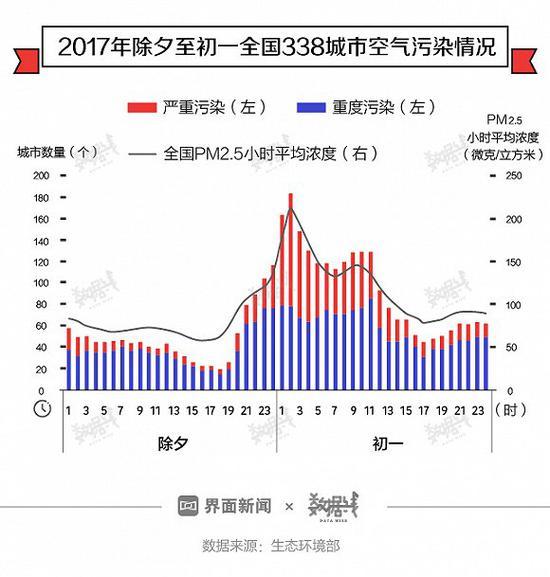生态环境部监测数据显示,2017年除夕至初一,受烟花爆竹集中燃放影响,多数城市PM2.5浓度快速上升。除夕夜18时至初一凌晨2时,全国空气质量重度及以上污染城市数量从19城升至183个,PM2.5平均小时浓度由62微克/立方米升至213微克/立方米。