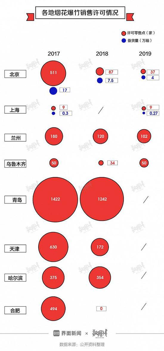 比如北京。2019年,北京规定五环内禁放烟花,许可烟花爆竹零售点数量降至37家,规定销售时间为1月30日至2月9日(农历腊月二十五至正月初五),并且需要实名制购买。