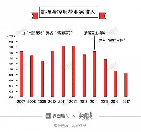 昔日的北京奥运会鸟巢烟花供应商、"烟花第一股"、"烟花大王"熊猫烟花(600599.SH),近年烟花鞭炮销售收入也不断下滑。为寻找新的增长点,熊猫烟花在2014年涉足互联网金融领域,在2015年更名熊猫金控,烟花就卖得更少了。