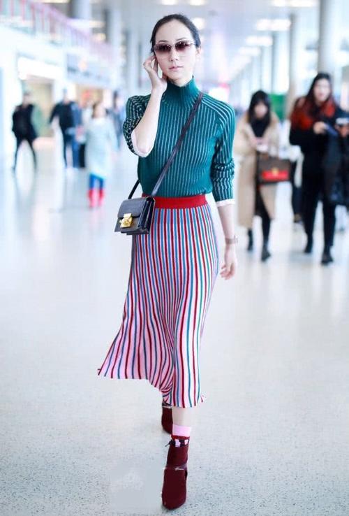 韩雪的其他穿搭也是很有自己的特点,看看这套机场私服,身穿一件绿色的竖直条纹针织衫,颜色比较暗,搭配粉色系的条纹长裙打破沉闷感,中和几分老气的感觉,显得更加俏丽!