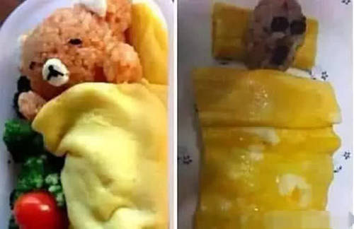 3.不光是服装有买家秀和卖家秀,就连外卖也有这两种画风,比如说上面这份小熊蛋皮糯米饭(随便起的名字...),左边是卖家秀,看上去特别的可爱,可爱到根本不想”伤害“它,而右边这个买家秀,真的是想有多远扔多远。