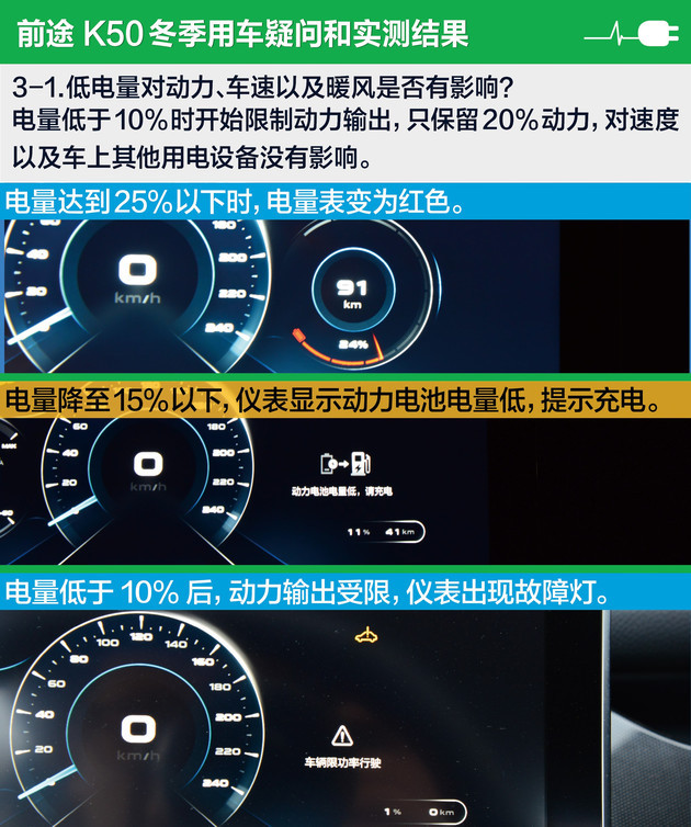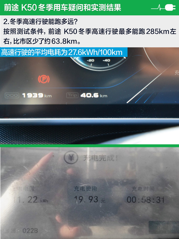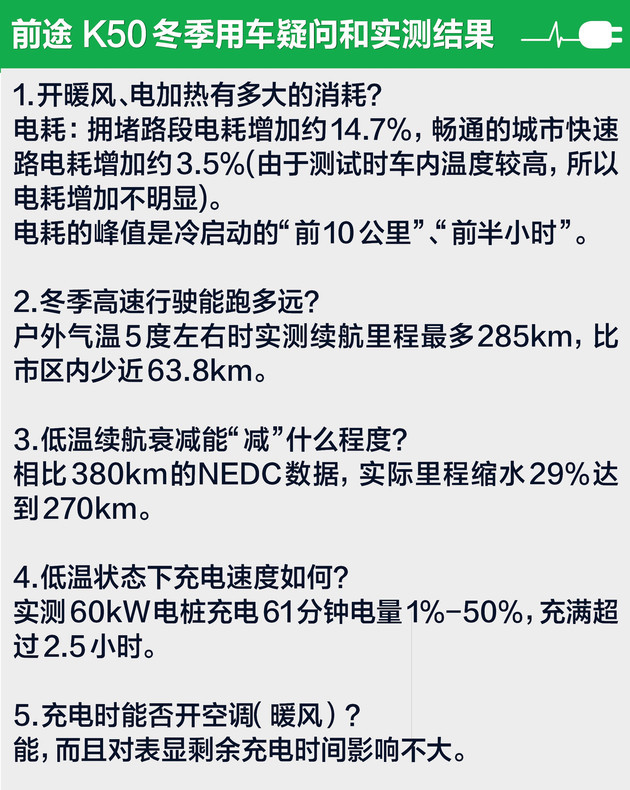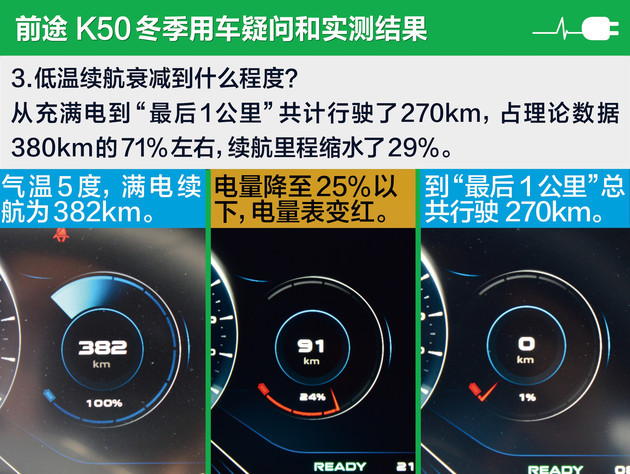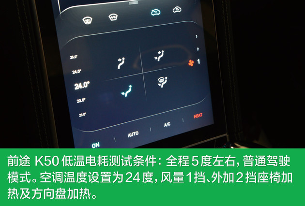 2.极限里程:在经过实测得出冬季前途 K50综合续航270km,为NEDC(380km)续航里程的71%左右。续航衰减程度好于在之前测试的车型,其中一部分原因是测试时户外温度相较之前有所提升。