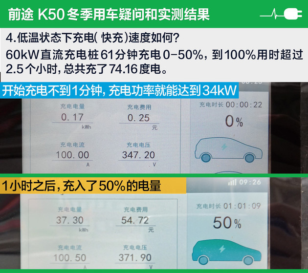 低温的用车环境确实是对电池的一大考验。电池在低温环境下活性会降低,影响电池的实际容量。前途 K50在到达充电桩时,动力电池的温度处在正常的温度区间,开始充电后不需要耗费时间给动力电池进行升温,所以开始充电时就有着不错的充电效率。电池电量1%左右时,用国家电网60kW直流充电桩给前途 K50充电,实际充电电流与电压数值见下图。