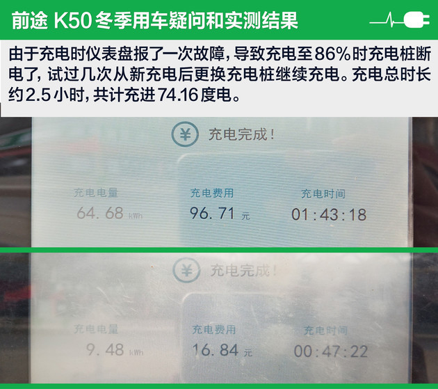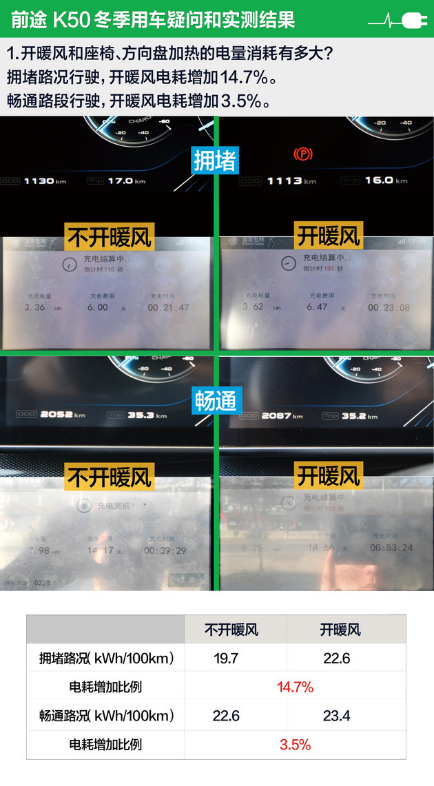 本次没有测试冷启动的电耗,原因是前途 K50表显电耗无法清零,需要开始测试时需要将电池充满,在充电时电池管理系统会给电池进行升温,当电池充满,动力电池温度即进入正常工作温度范围。所以冷启动阶段电耗本次没有测试。