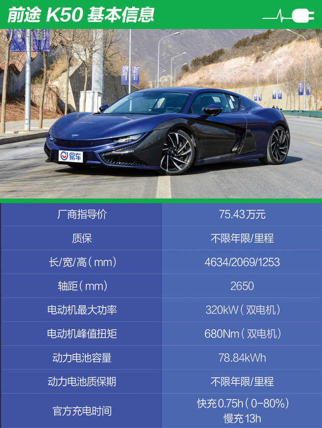 《新能源实验室》第五期,前途 K50,这是一辆定位于纯电动城市跑车的车型,带有浓重的中国特色。站在消费者角度来说,前途 K50的上市可谓是国产电动车领域中细分市场的“独一份”,接近于“超跑”的外形设计让人很难想象到这是一辆国产车。官方标称的380km续航表现(NEDC)在国产电动车中并不算短,可是前途 K50有着接近2吨的自重,前后双电机与前235后265的胎宽,注定这不会是一辆低能耗的车型。那么具体续航表现如何?本篇文章将通过我们实测得出的结果为您解答。