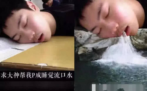 4、这位男生自己在课堂上睡觉时,被同桌偷拍了,同桌想要恶搞一下这位男生,于是找到P图大神,要求大神帮忙,把这位睡觉的男生P成睡觉流口水的样子,谁知道这位大神真的太调皮了,竟直接将男生口中的口水,做成了一条河流,这也太夸张了吧,不得不说大神真的是太皮了。