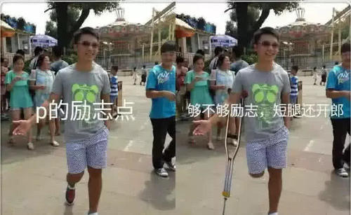 3、这个男生走在街上,没什么特别的地方,很平常,然后小哥就想要大神帮他P的励志一点。于是,大神就把小哥的腿给P成了残疾,还拄着一根拐杖,确实很励志了,看看这位残疾人士每天还能这么开心是不是很励志。