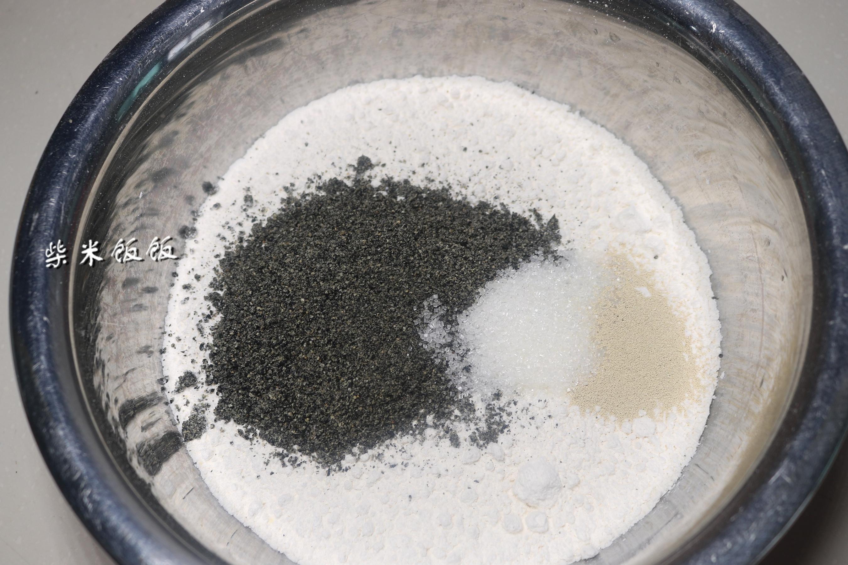 2,空盆内倒入400 g 面粉,5 g 酵母,10 g白糖促进发酵,再把擀好的黑芝麻粉倒入盆内。