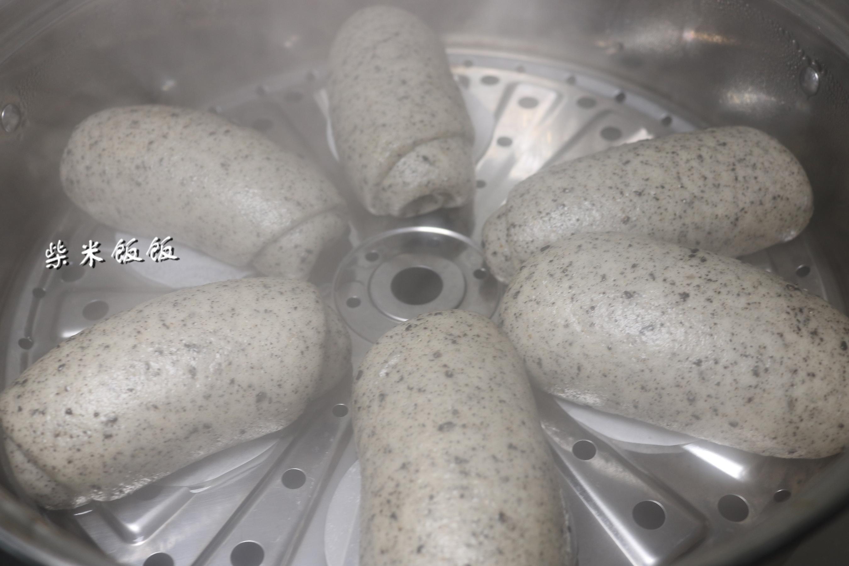 8,蒸锅内加入足量的温水,把做好的黑芝麻花卷放在蒸屉上,盖上锅盖,让小花卷醒发至1.5倍大,在30多度的环境下,大概需要半个小时就可以发好。