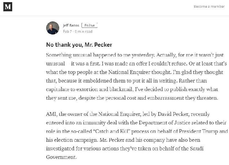 “昨天,一些不寻常的事情在我身上发生了。准确地说,对我而言并非仅仅是‘不寻常’,而是第一次遭遇的状况。”贝索斯在博客中写道,“我决定不向敲诈与勒索低头,而是公开他们发送给我的东西,即便要付出代价……”