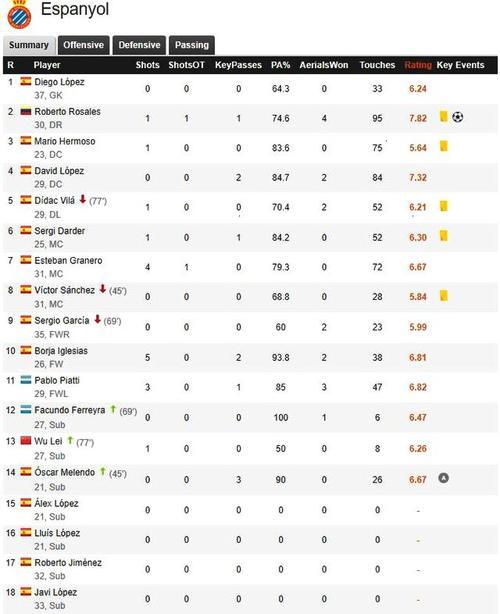 相比较之下,塞尔吉奥-加西亚就太差了!这位35岁的老将,在首发69分钟时间里,没有进球没有助攻没有射门没有威胁球,最终只获得了5.99分的低分,可以说是本场比赛西班牙人首发的败笔!另外皮亚蒂表现还不错,3次射门,拿到了6.82分。