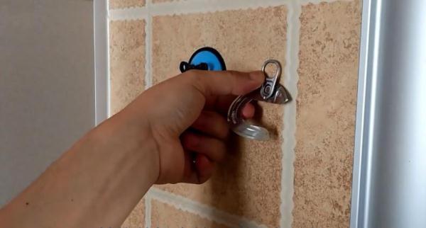 接下来我们再分享它的第二个妙用,这个妙用也是非常实用的,首先我们把拉环给它转上去,然后用剪刀把中间部分给它减下来,这样家里有挂钩的也可以,没挂钩的把它粘在墙上也可以,它可以用来挂很多东西。例如拖把、扫把等很多圆柱体,都可以挂在上面,非常的简单实用。