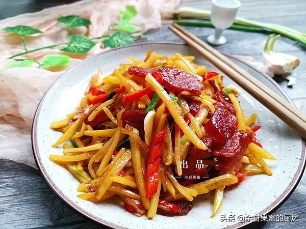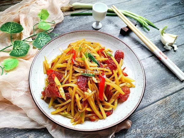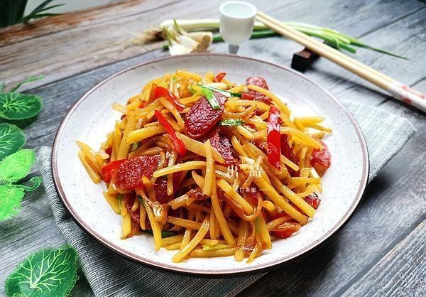 小贴士:土豆发芽了、发青了不宜食用;土豆切好之后冲洗去部分淀粉,炒制后脆爽,炒制时不粘锅;腊肠容易熟,切薄一些,后添入同炒即可;喜欢吃辣的,可以用一些红干椒段。关于腊肠炒土豆丝,你吃过吗?如果你有更好的制作方法,欢迎留言交流学习,谢谢。