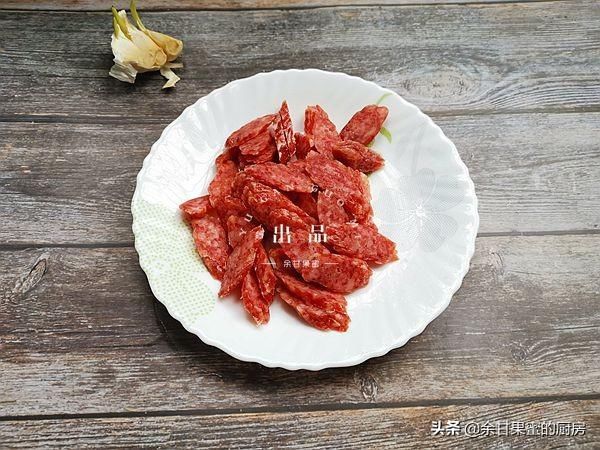 3、腊肠稍微冲洗一下,然后切片,尽量厚薄均匀。