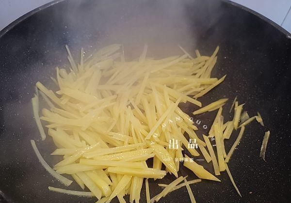 2、土豆去皮,切丝,可以切为粗条,比平时的土豆丝粗一些,口感更好。切好之后用清水冲洗一下,去掉一些淀粉。