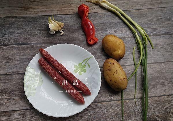 食材:土豆200克、腊肠2根、红辣椒适量、蒜头2瓣、香葱2根、精盐2克、生抽半匙、食用油适量。
