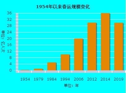 1954年,第一次有据可查的春运人数为2300万人次,1979年突破1亿人次,1984年突破5亿人次,1994年突破10亿人次,2006年突破20亿人次,2012年突破30亿人次,2019年预计将达到29.9亿人次。