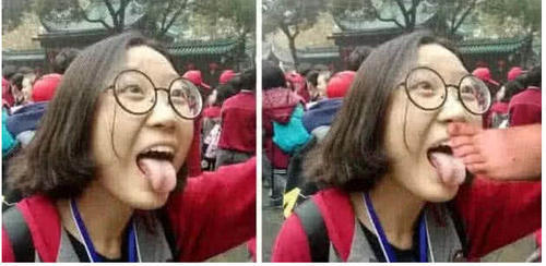 2.小姑娘大学毕业了,很是高兴的约上同学一起出门旅游,拍了一张搞笑的照片,竟然被大神恶搞了!本来很可爱的伸舌头,结果被大神P了一只脚上去!