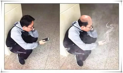 1.图片中的这位大哥蹲在地上玩手机拍下了这张照片,不过他的样子看起来没有那种有人生经历的样子,于是他就想要大神把他p得看起来沧桑一点!本来以为会p出个酷帅的胡子大叔,没想到大神竟然把他的头发p成秃头,这个样子从远处一看,还真的是挺沧桑的!