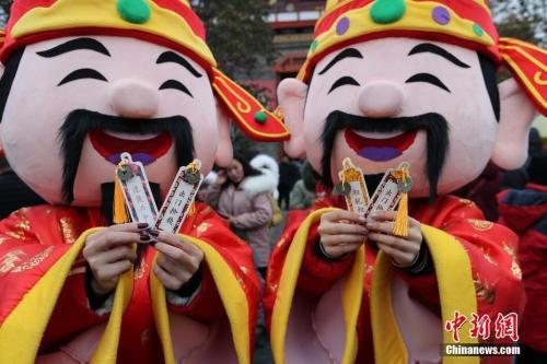 资料图:“财神”展示红包里的“宋钱”。 王中举 摄